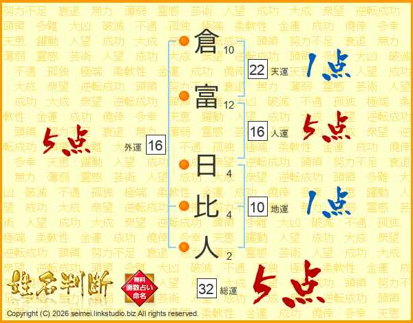 倉富日比人さんの総運は32画の5点!