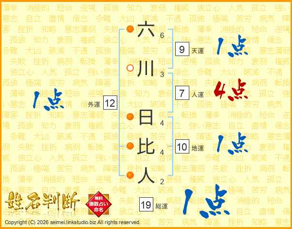 生活面を象徴する運勢です。外部から受ける影響力を表し、結婚運、家庭運や職場、環境への順応性を表します。総運から人運を引いた画数。姓や名が1文字の場合を除く。