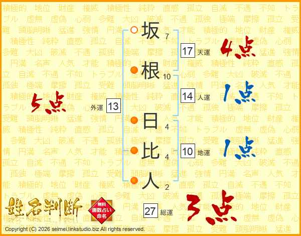 坂(7画)根(10画) 日(4画)比(4画)人(2画)