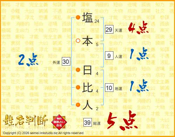 塩本日比人さんの総運は39画の5点!
