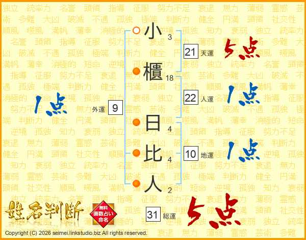 生活面を象徴する運勢です。外部から受ける影響力を表し、結婚運、家庭運や職場、環境への順応性を表します。総運から人運を引いた画数。姓や名が1文字の場合を除く。