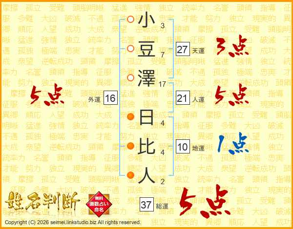 小豆澤日比人さんの総運は37画の5点!