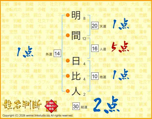 明(8画)間(12画) 日(4画)比(4画)人(2画)
