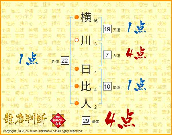 横川日比人さんの総運は29画の4点!