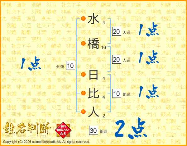 水(4画)橋(16画) 日(4画)比(4画)人(2画)
