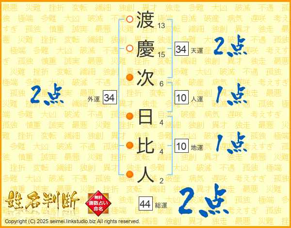 渡(13画)慶(15画)次(6画) 日(4画)比(4画)人(2画)
