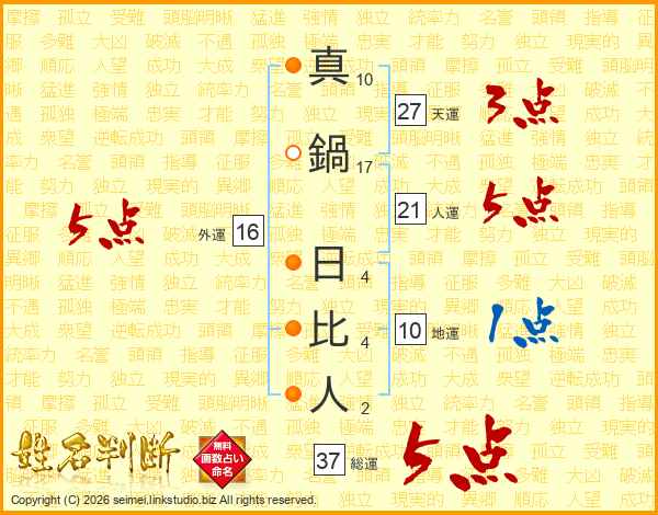 真鍋日比人さんの総運は37画の5点!