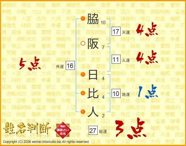 脇(10画)阪(7画) 日(4画)比(4画)人(2画)