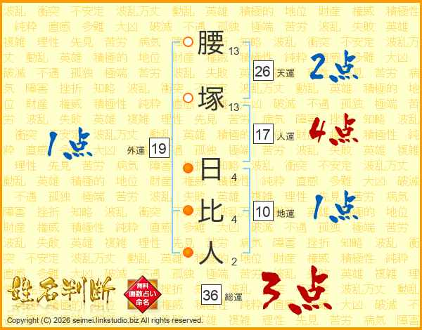 腰(13画)塚(13画) 日(4画)比(4画)人(2画)