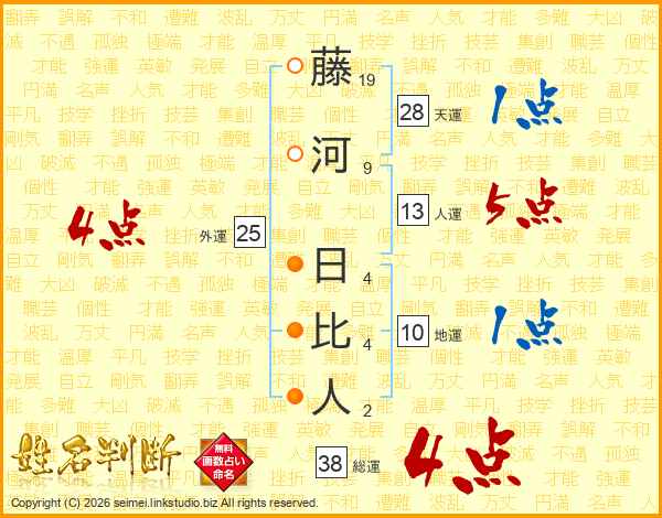 生活面を象徴する運勢です。外部から受ける影響力を表し、結婚運、家庭運や職場、環境への順応性を表します。総運から人運を引いた画数。姓や名が1文字の場合を除く。