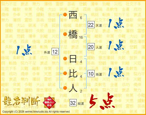 西橋日比人さんの総運は32画の5点!