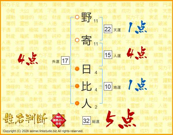 野(11画)寄(11画) 日(4画)比(4画)人(2画)