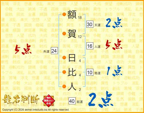 額賀日比人さんの総運は40画の2点!
