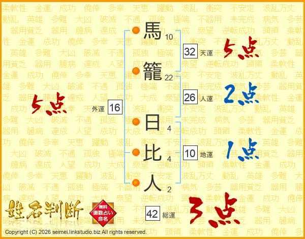馬籠日比人さんの外運は16画の5点!
