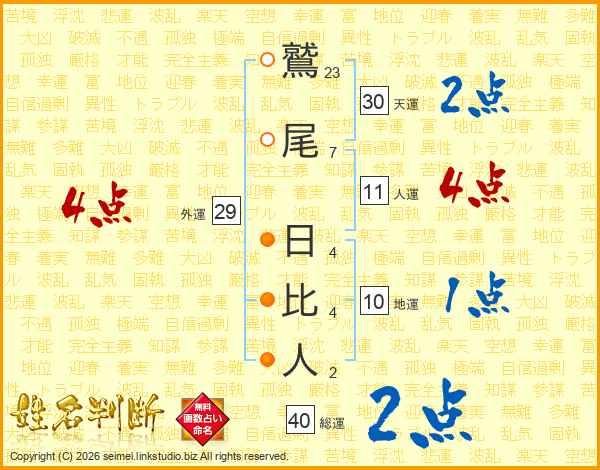 鷲(23画)尾(7画) 日(4画)比(4画)人(2画)