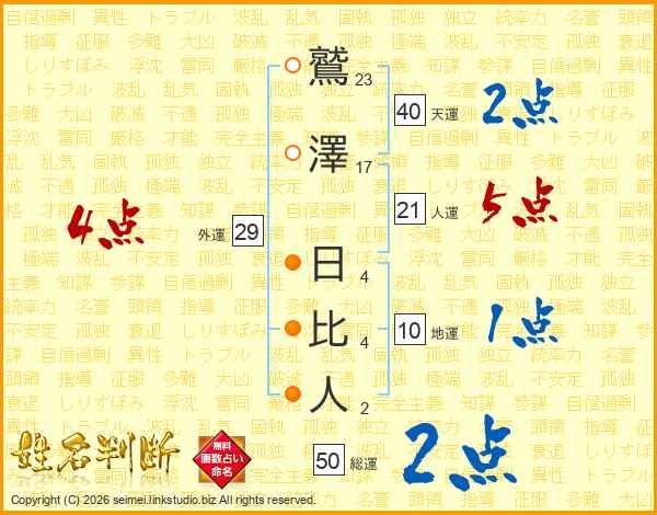 鷲(23画)澤(17画) 日(4画)比(4画)人(2画)