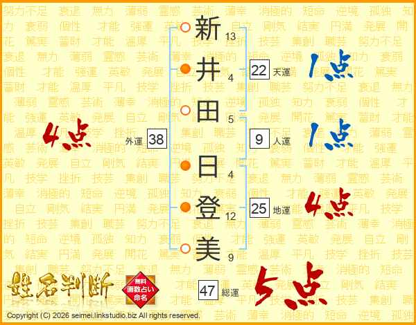 新(13画)井(4画)田(5画) 日(4画)登(12画)美(9画)