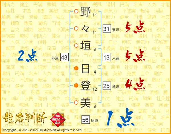 野(11画)々(11画)垣(9画) 日(4画)登(12画)美(9画)