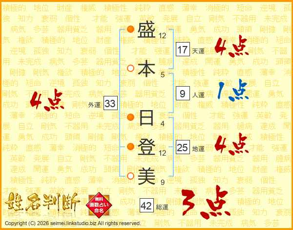 盛本日登美さんの地運は25画の4点!