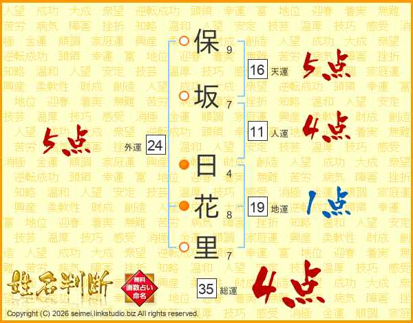 保(9画)坂(7画) 日(4画)花(8画)里(7画)