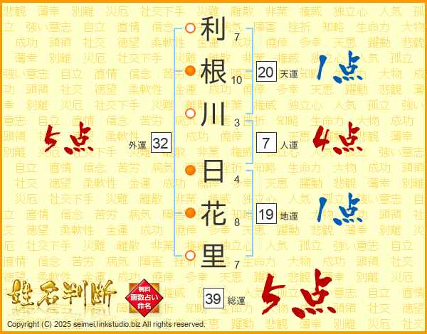 利(7画)根(10画)川(3画) 日(4画)花(8画)里(7画)