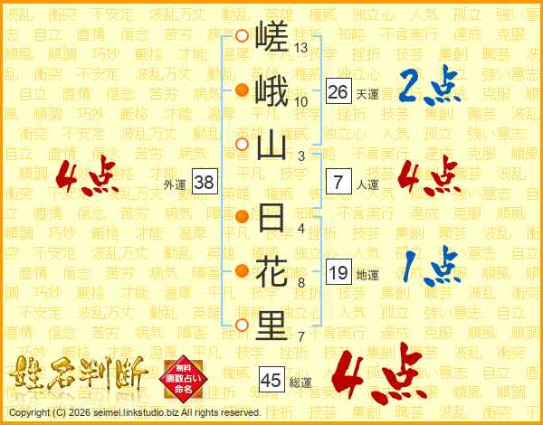 嵯(13画)峨(10画)山(3画) 日(4画)花(8画)里(7画)