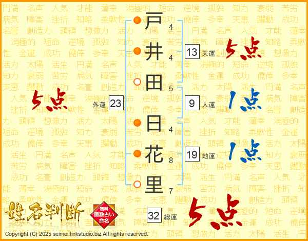 戸(4画)井(4画)田(5画) 日(4画)花(8画)里(7画)