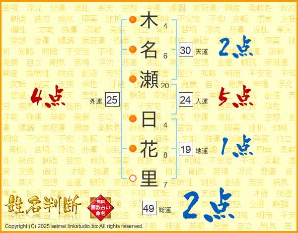 木(4画)名(6画)瀬(20画) 日(4画)花(8画)里(7画)