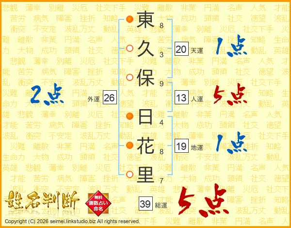 東(8画)久(3画)保(9画) 日(4画)花(8画)里(7画)