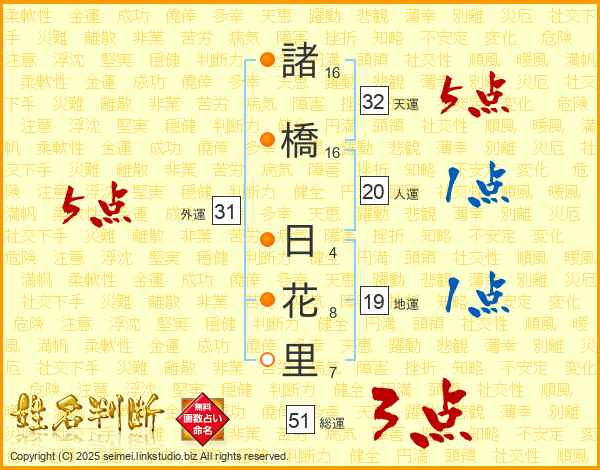 諸(16画)橋(16画) 日(4画)花(8画)里(7画)