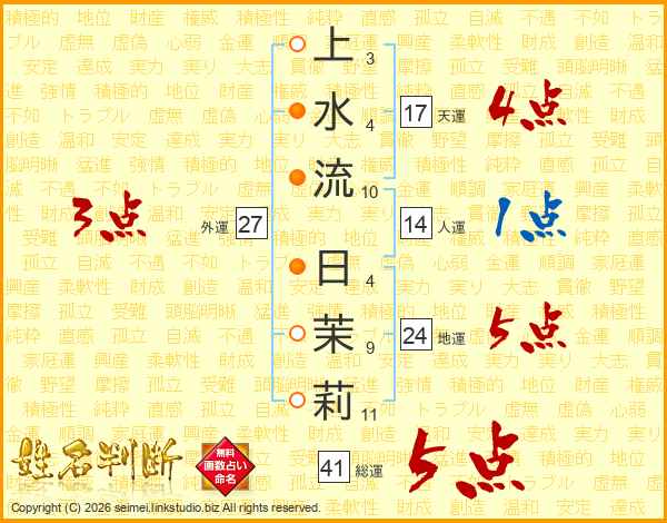 上(3画)水(4画)流(10画) 日(4画)茉(9画)莉(11画)