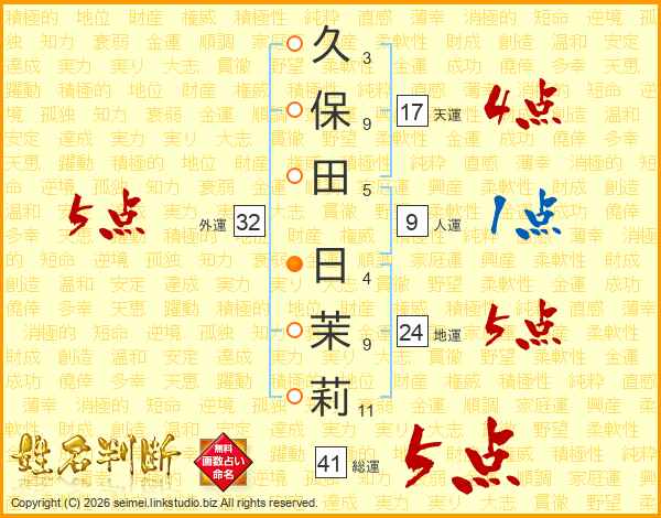 久保田日茉莉さんの総運は41画の5点!