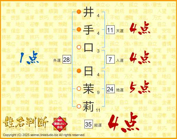井(4画)手(4画)口(3画) 日(4画)茉(9画)莉(11画)
