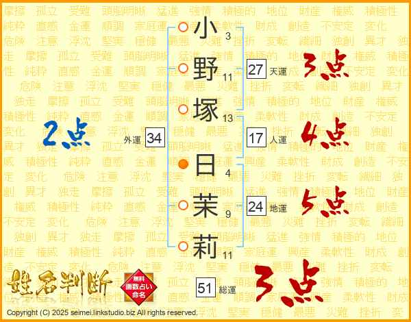 小(3画)野(11画)塚(13画) 日(4画)茉(9画)莉(11画)