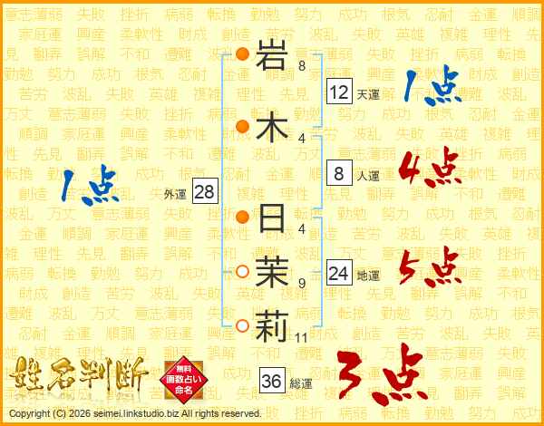 岩(8画)木(4画) 日(4画)茉(9画)莉(11画)