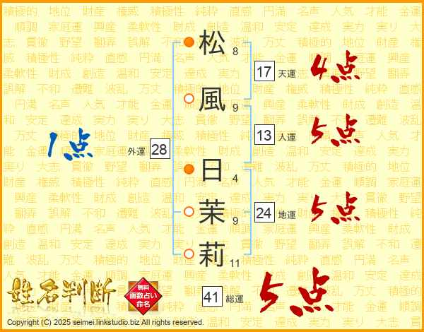 松(8画)風(9画) 日(4画)茉(9画)莉(11画)