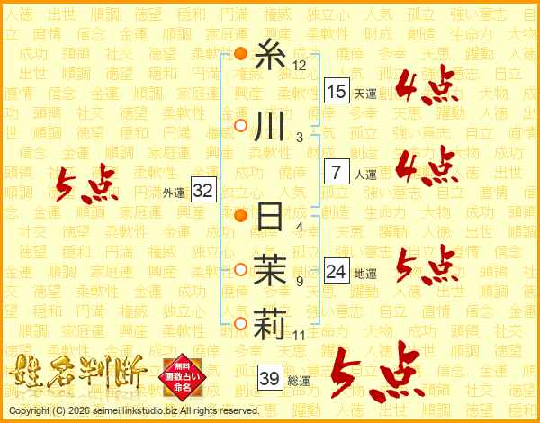 糸(12画)川(3画) 日(4画)茉(9画)莉(11画)