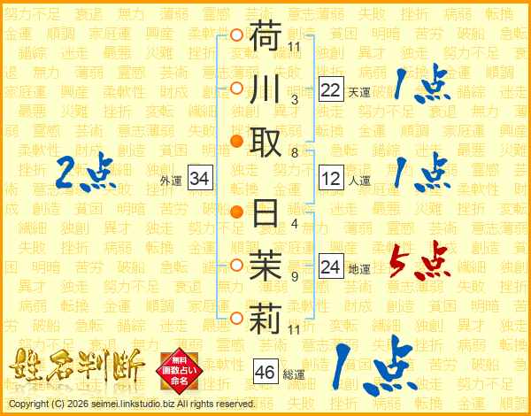 荷(11画)川(3画)取(8画) 日(4画)茉(9画)莉(11画)
