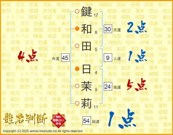 鍵(17画)和(8画)田(5画) 日(4画)茉(9画)莉(11画)
