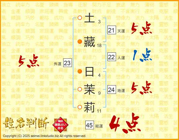 土(3画)藏(18画) 日(4画)茉(9画)莉(11画)