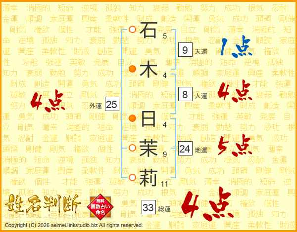 石(5画)木(4画) 日(4画)茉(9画)莉(11画)