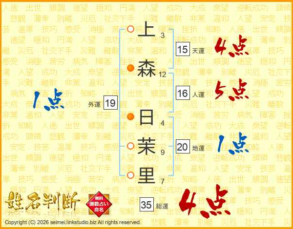 上(3画)森(12画) 日(4画)茉(9画)里(7画)