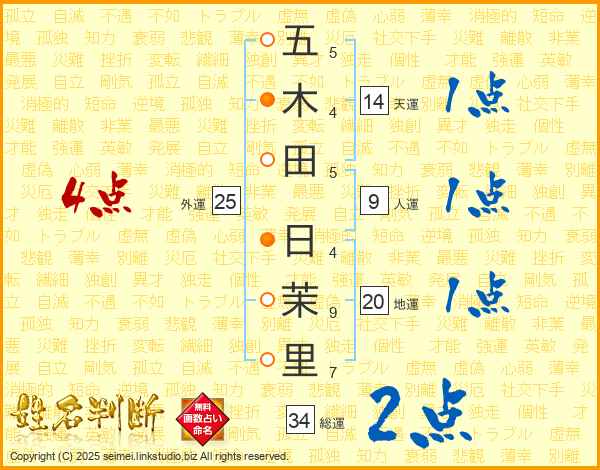 五(5画)木(4画)田(5画) 日(4画)茉(9画)里(7画)