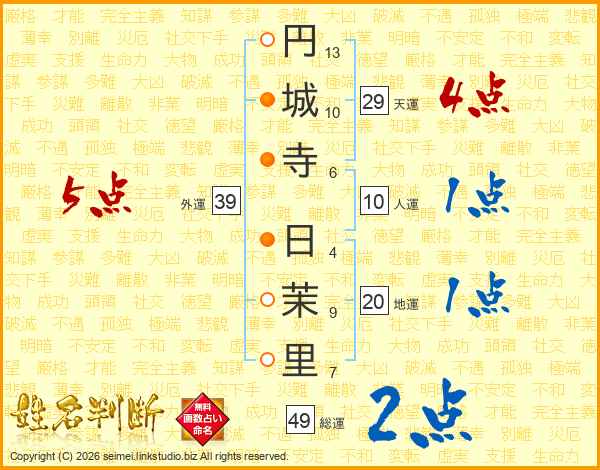 円(13画)城(10画)寺(6画) 日(4画)茉(9画)里(7画)