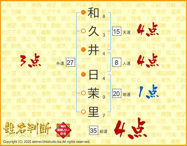 和(8画)久(3画)井(4画) 日(4画)茉(9画)里(7画)