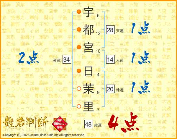 宇(6画)都(12画)宮(10画) 日(4画)茉(9画)里(7画)