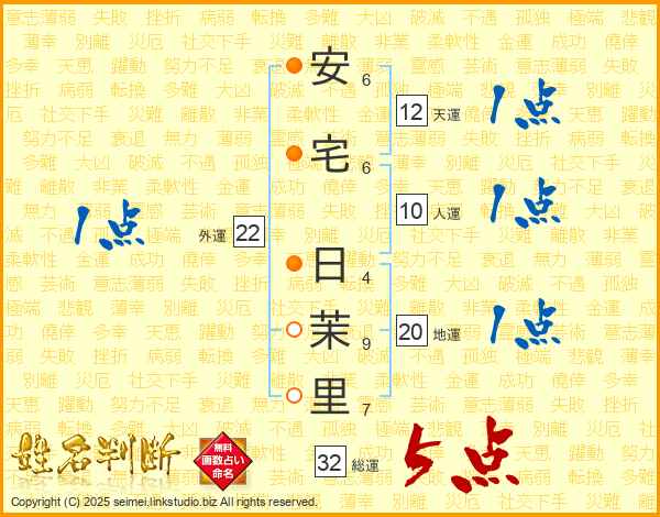 安(6画)宅(6画) 日(4画)茉(9画)里(7画)
