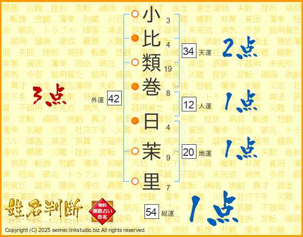小(3画)比(4画)類(19画)巻(8画) 日(4画)茉(9画)里(7画)