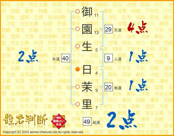 御(11画)園(13画)生(5画) 日(4画)茉(9画)里(7画)