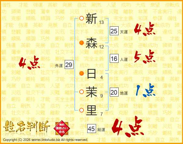 新(13画)森(12画) 日(4画)茉(9画)里(7画)